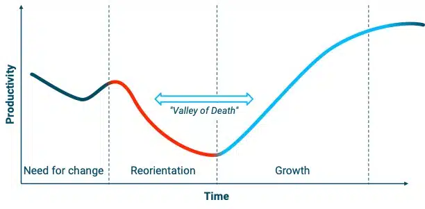 And therein lies the challenge for every change: There is a trough, a ‘valley of death’, in which the productivity of a company suffers, in which old structures and methods no longer work, and the new ones do not yet work.